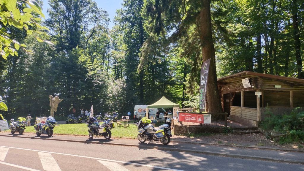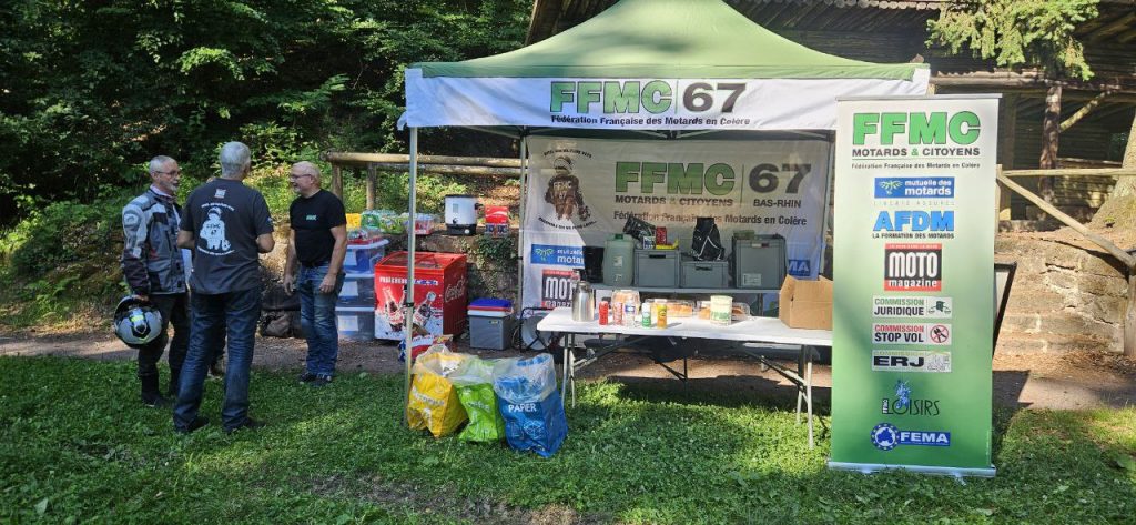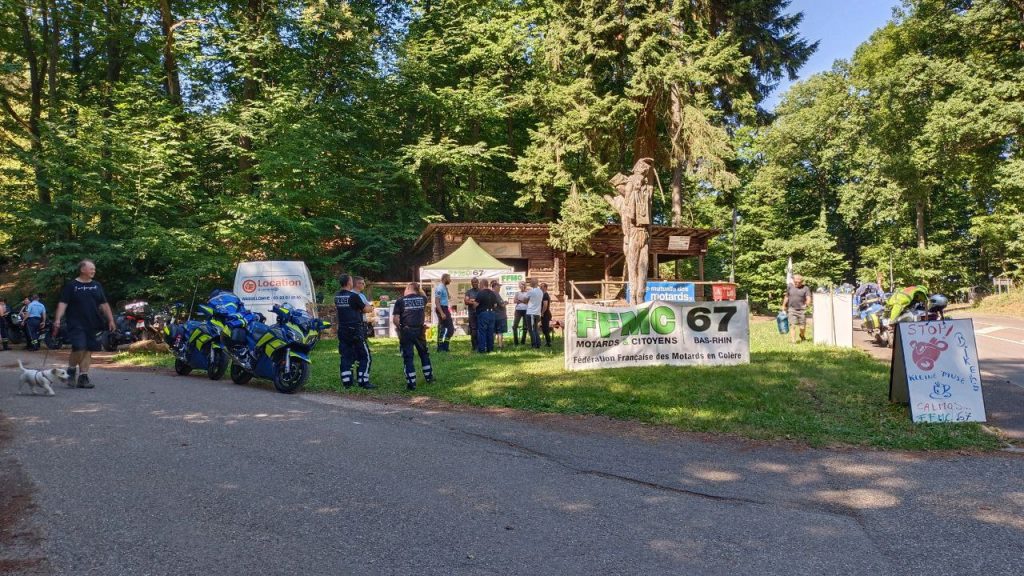En présence de gendarmes français et de policiers allemand à moto, la FFMC 67 a installé un relais Calmos pour la journée du 29 Juin afin de permettre aux motards empruntant cet axe de faire une pause café ou boisson fraiche et de discuter moto et conduite en zone montagneuse.