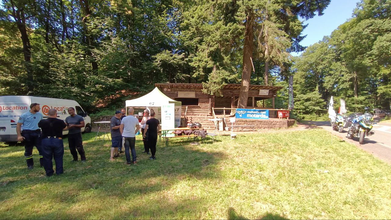 En présence de gendarmes français et de policiers allemand à moto, la FFMC 67 a installé un relais Calmos pour la journée du 29 Juin afin de permettre aux motards empruntant cet axe de faire une pause café ou boisson fraiche et de discuter moto et conduite en zone montagneuse.