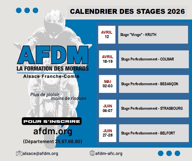 Pour vous perfectionner dans la conduite de votre moto, l’AFDM Alsace / Franche-Comté est là pour vous y aider. Les inscriptions à leurs stages sont ouvertes.